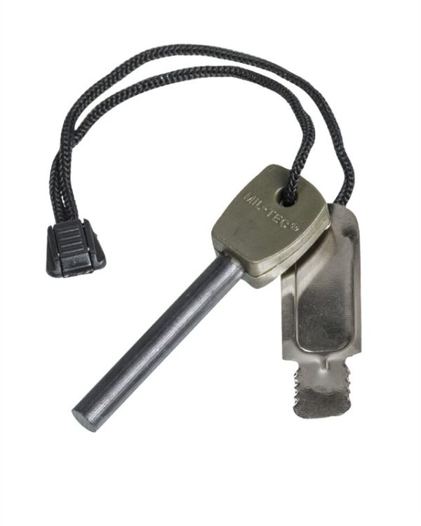 Acciarino militare MIL-TEC funzionale e semplice da usare, funziona bene anche in condizioni climatiche avverse. Dotato di raschietto e cordino di trasporto